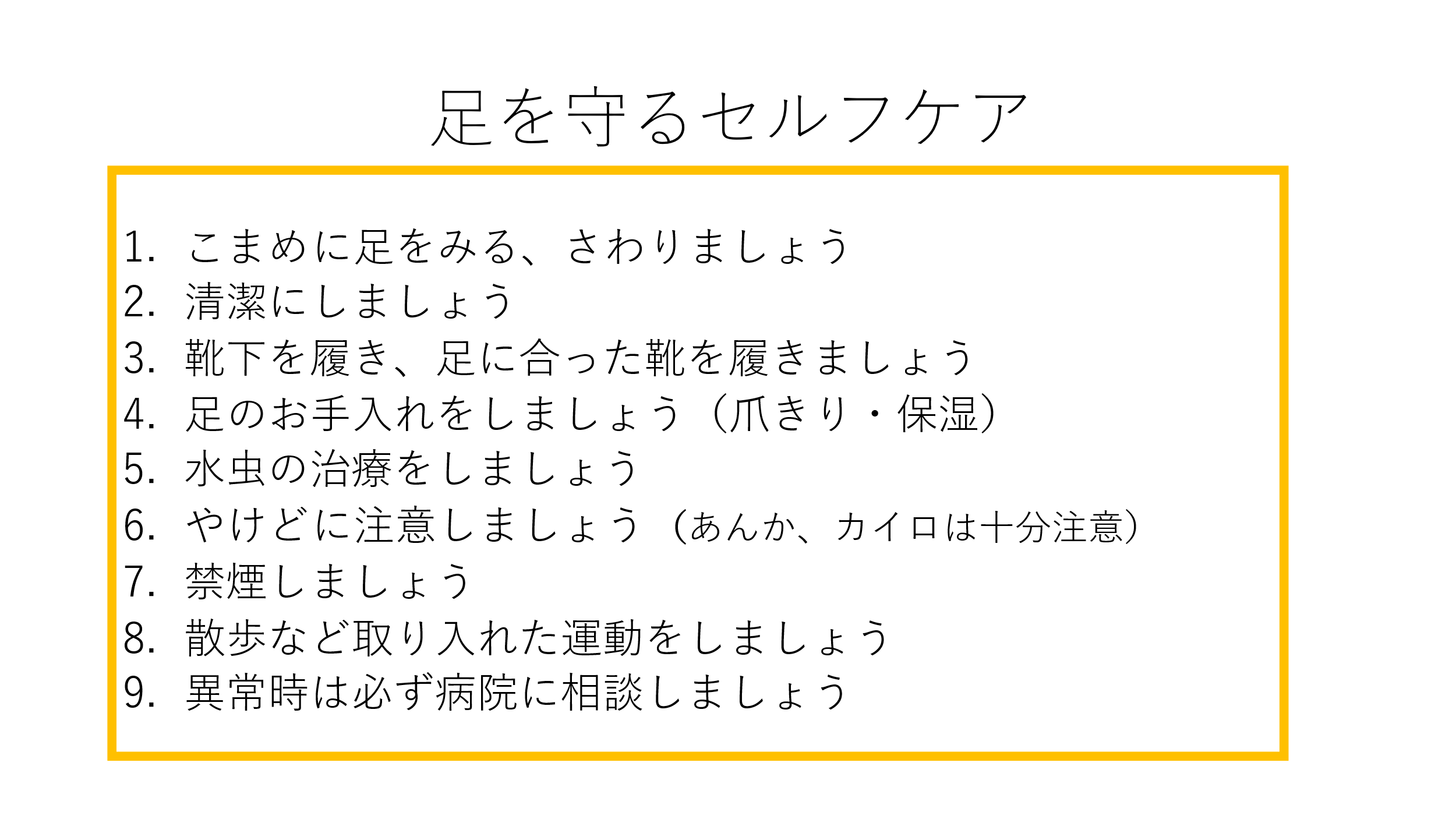 無理しないということは、見えないのに爪を切る。体調が悪いのに入浴をする。体調が悪いのに足を洗うなど、体調に合わせ無理のない範囲でケアを行いましょう。